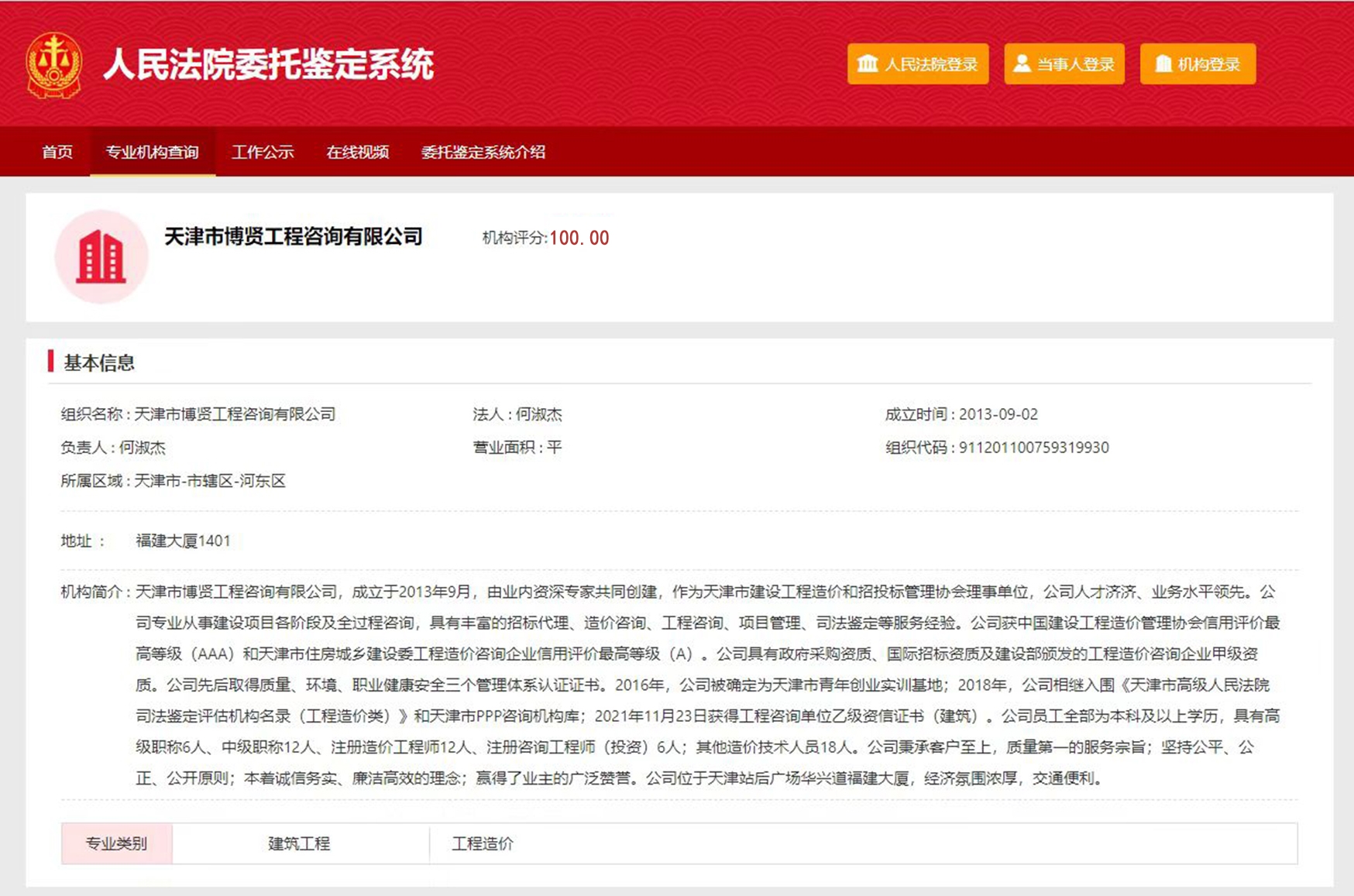 2021年获人民法院委托鉴定系统机构评分最高分100分